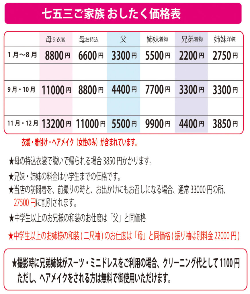 ご一緒にご家族集合の撮影を追加する時に、ご家族様が着物をお召しになる場合の価格表です。